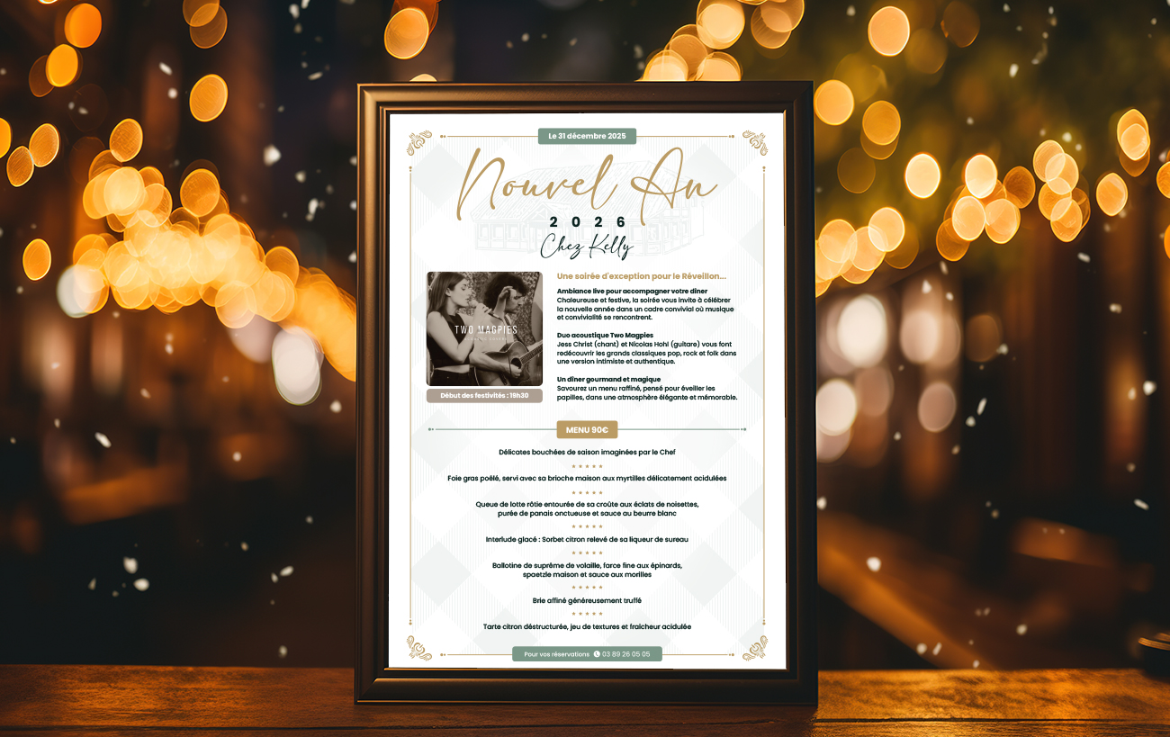 La seconde affiche a été réalisée à l’occasion du Nouvel An, avec l’objectif de promouvoir une soirée d’exception. Le travail graphique s’oriente ici vers une ambiance plus festive et premium, jouant sur des codes élégants, une typographie soignée et une hiérarchisation claire des contenus (menu, animation musicale, informations pratiques).