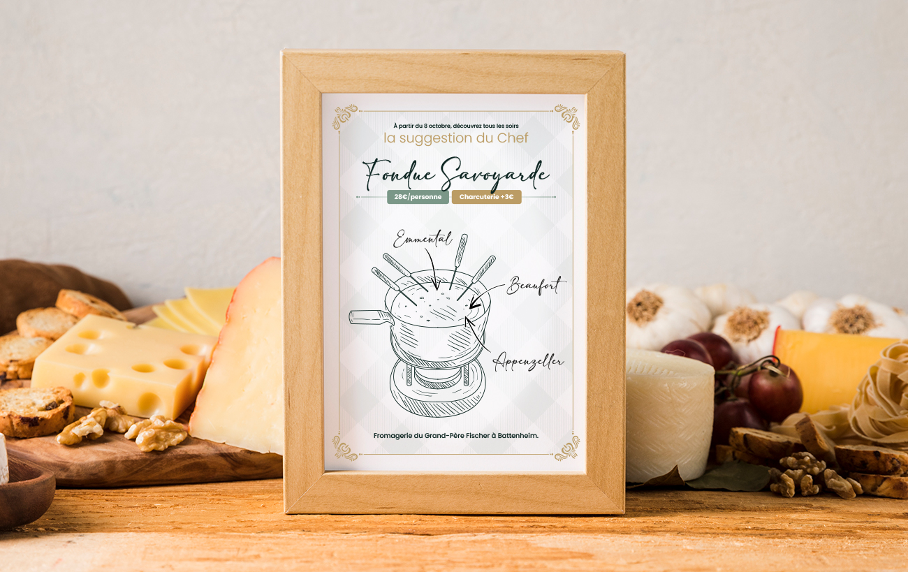 La première affiche annonce l’arrivée des fondues savoyardes à la carte. Le parti pris graphique repose sur une illustration centrale dessinée, mettant en scène le caquelon et les fromages emblématiques de la recette.